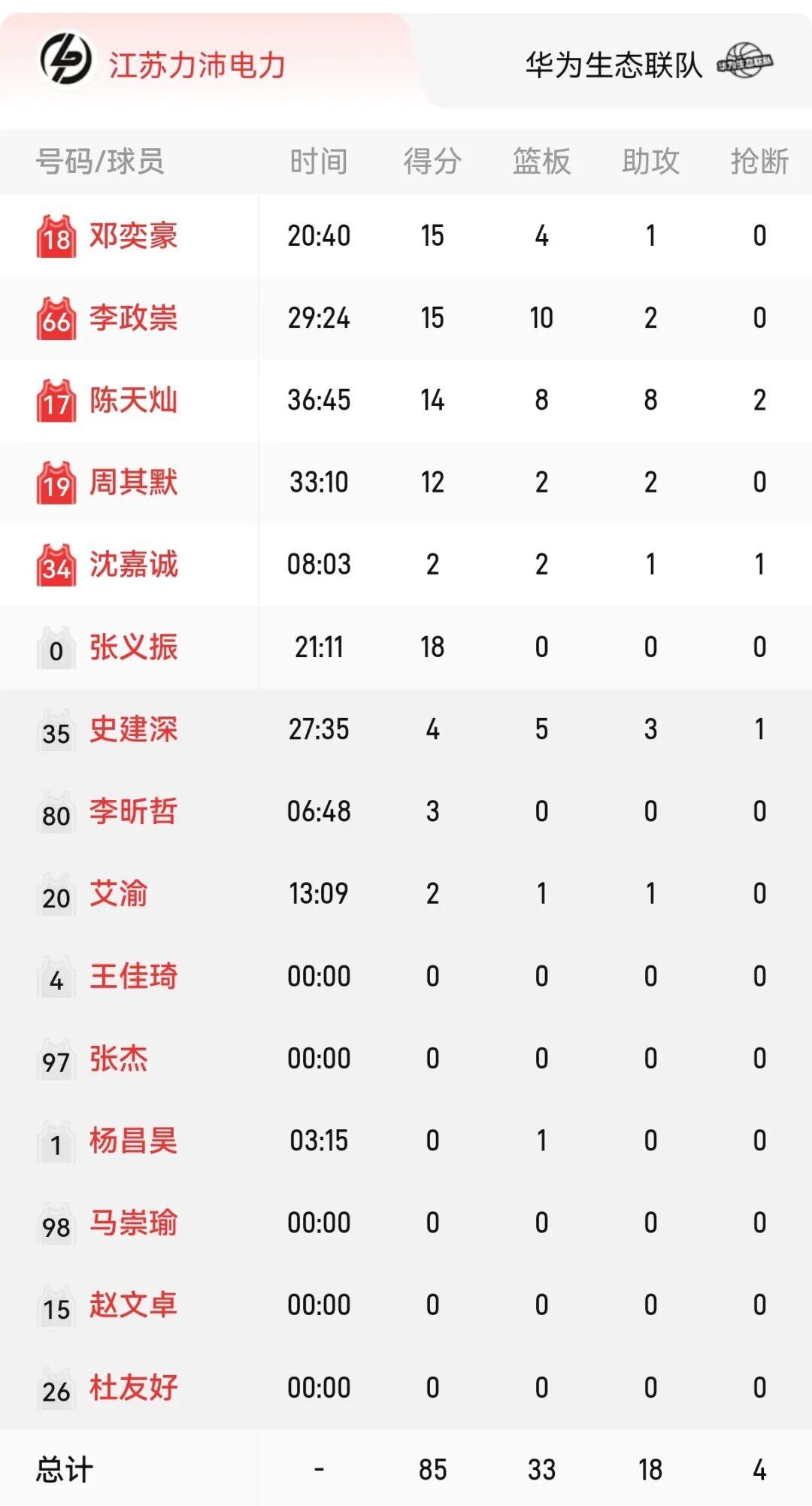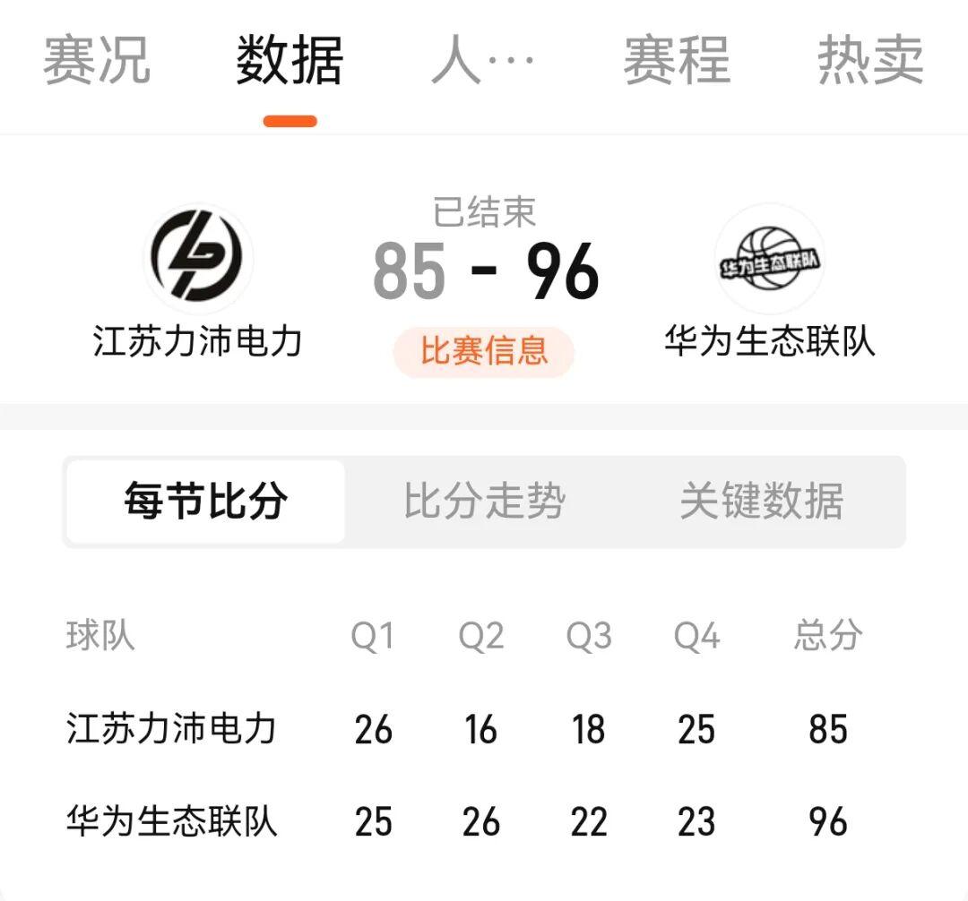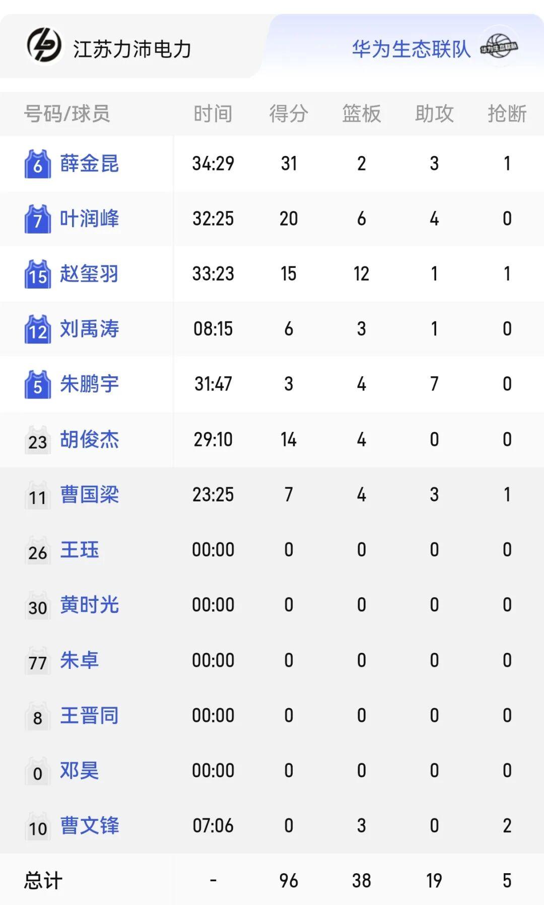 本场,华为生态联队薛金昆拿下全场最高31分,叶润峰、赵玺羽、胡俊杰得分上双;江苏力沛电力张义振空砍18分,李政崇、邓奕豪均拿下15分。