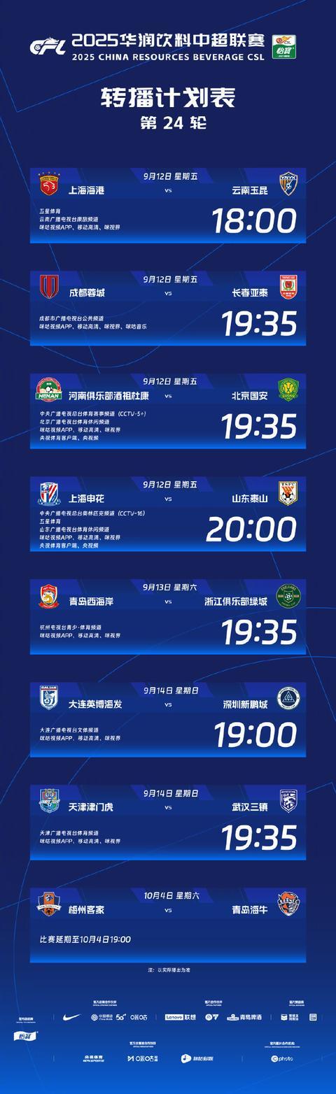 9月12日,中超联赛第24轮重燃战火,目前在积分榜暂列前四的成都蓉城、上海申花、上海海港和北京国安同时出战,联赛争冠悬念再度拉满。