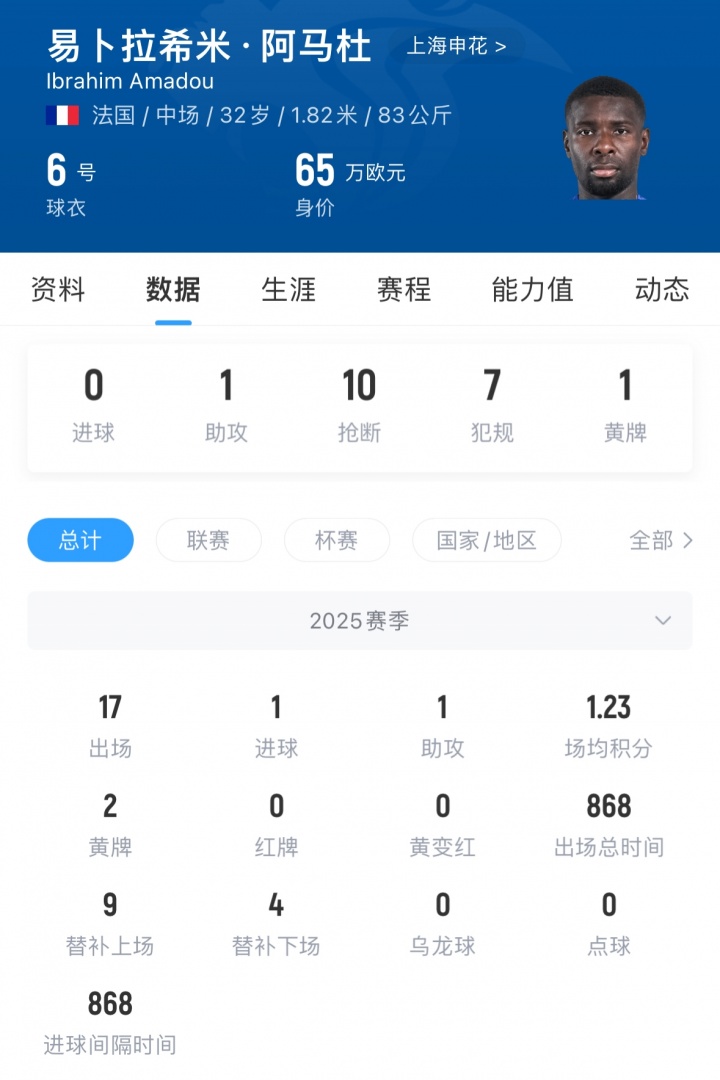 阿马杜现年32岁,司职中场,他上赛季为申花出场17次,贡献1球1助,现身价65万欧。