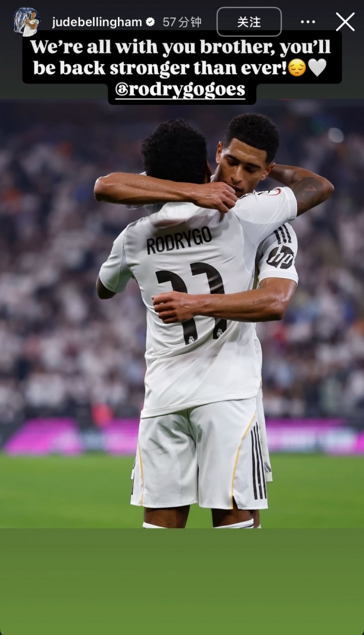 贝林厄姆更新社媒,晒出和罗德里戈拥抱的赛场照并鼓励后者:“我们与你同在,你将会比以往更强大的姿态归来!”