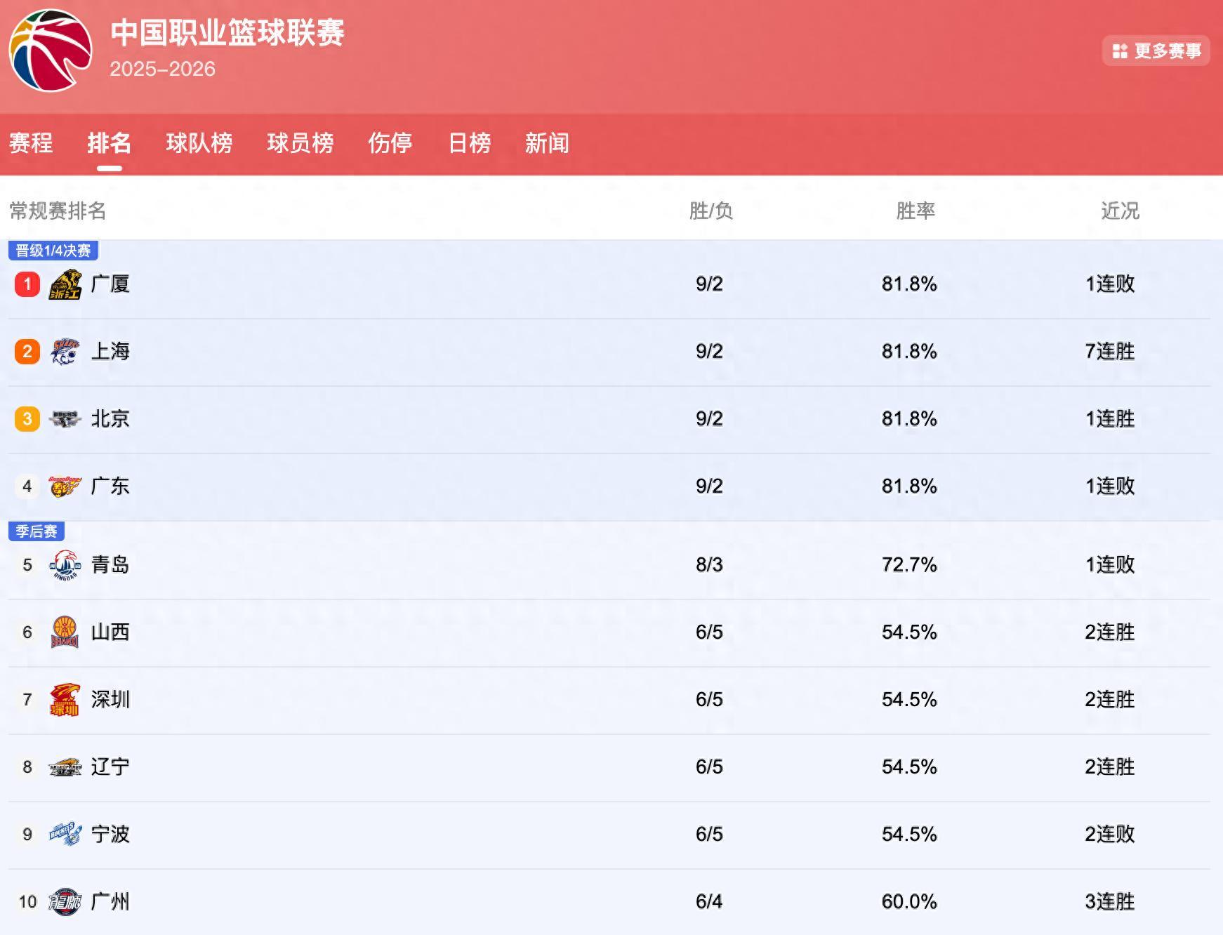 另外一方面,上海男篮和北京男篮本赛季进行补强之后,整体的阵容底蕴相当深厚。所以接下来只要不出意外,基本上他们都能够稳定在前五的位置。值得一提的是,广东男篮在最近被浙江队绝杀之后,从第二名到第三名,现在掉到了第四名。