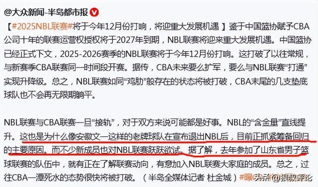 青岛媒体“半岛都市报”跟踪报道,据传,CBA未来要么扩军,要么与NBL联赛“打通”实现升降级。总之,NBL联赛如同“鸡肋”般存在的状态将被打破,CBA末尾的几支垫底球队也不会再无限期躺平。