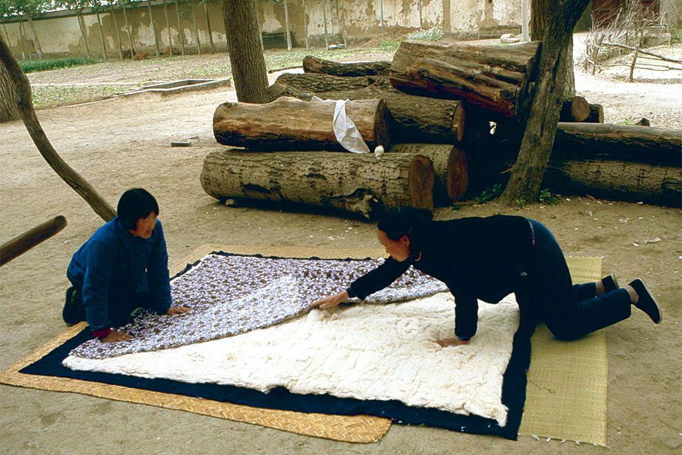 缝被子的妇女。