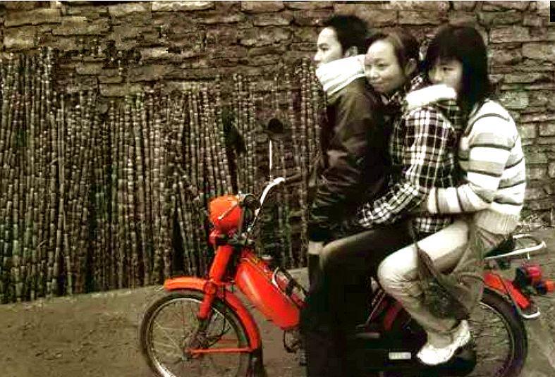 嘉陵CJ50摩托车载着两名女孩,